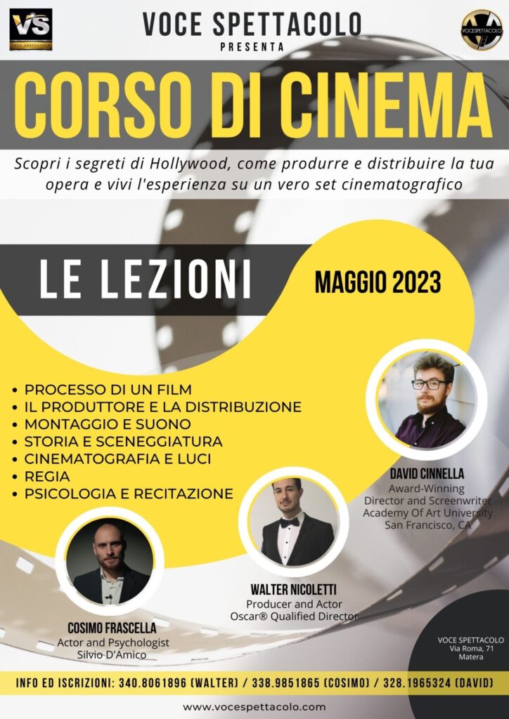 The course is being organized by a team of experienced filmmakers and industry professionals, including David Cinnella, Award-Winning Director and Screenwriter (Academy of Art University of San Francisco, CA) and italian actor Cosimo Frascella (Silvio D’Amico) who is also a psychologist. They are committed to providing with a comprehensive and practical education in the art of cinema.